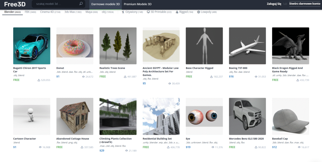 Nie musisz wszystkiego tworzyć od zera. Z pomocą przychodzą biblioteki modeli, gdzie bezpłatnie możesz pobrać setki tysięcy różnych obiektów. Szczególnie przydatny jest Sketchfab i Free3d.com.